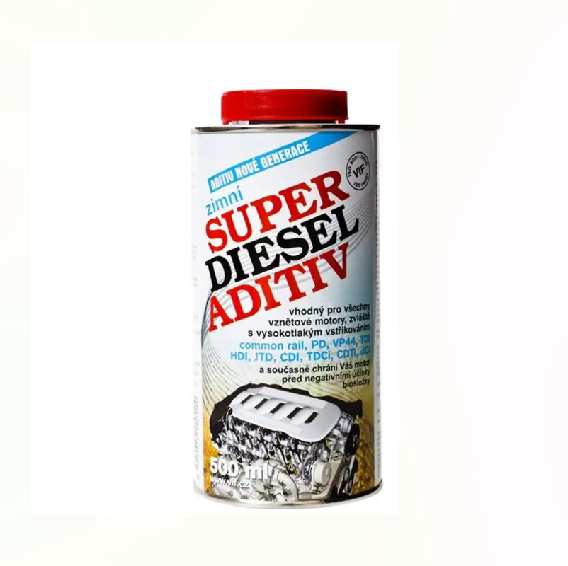 Zimní aditivum do nafty SUPER DIESEL ADITIV je multifunkční přísadou s protikorozním účinkem. Prodlužuje životnost palivového systému díky ochraně palivového čerpadla a údržbě čistoty vstřikovacích trysek. Udržuje nízkou spotřebu paliva a zlepšuje provozní pohotovost vozidla v zimním období zvýšením cetanového čísla nafty. Zimní aditivum SUPER DIESEL ADITIV oproti letní verzi obsahuje tzv. depresant, který snižuje bod tuhnutí a filtrovatelnost nafty při nízkých teplotách až o 5 °C. Protipěnivostní funkce přísady potlačuje pěnění paliva v celém palivovém systému. SUPER DIESEL ADITIV ochrání váš motor před negativními účinky biosložky, která je povinnou složkou každého paliva.